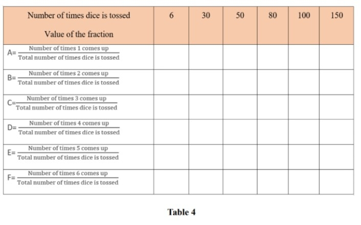 You will find that as the number of tosses gets larger, the values of each fractions come closer to 0.166 or 1/6.